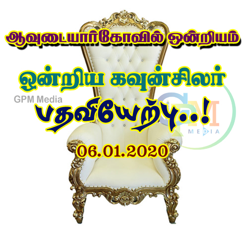 புதுக்கோட்டை மாவட்டம் ஆவுடையார்கோவில் ஒன்றியத்தில் வெற்றி பெற்ற 15 ஊராட்சி ஒன்றிய கவுன்சிலர்கள் ஆவுடையார்கோவில் ஊராட்சி ஒன்றிய அலுவலகத்தில் நாளை 06.01.2020 திங்கள்கிழமை காலை 11.00 மணிக்கு தேர்தல் நடத்தும் அலுவலர் முன்பாக பதவியேற்க உள்ளனர்.