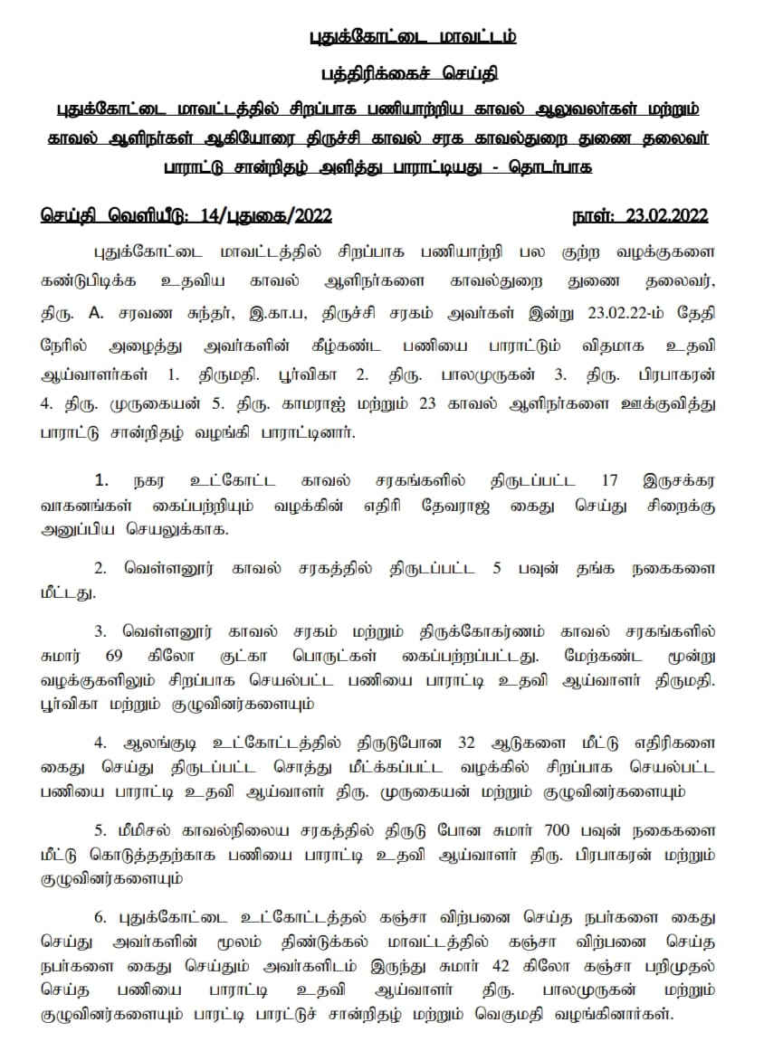 இந்த தனிப்படையினர் திருட்டு போன 700 பவுன் நகைகள் மீட்பு, புகையிலை பொருட்கள் பறிமுதல், கஞ்சா விற்றவர்களை கைது செய்தல், திருட்டு போன ஆடுகளை மீட்டும் சிறப்பாக செயல்பட்டனர். இதில் தனிப்படை சப்-இன்ஸ்பெக்டர்கள் பூர்விகா, காமராஜ், பாலமுருகன், பிரபாகரன், முருகையன் மற்றும் 23 போலீசாரை திருச்சி சரக டி.ஐ.ஜி. சரவணசுந்தர் பாராட்டி நற்சான்றிதழ் வழங்கினார். இதனை புதுக்கோட்டை போலீஸ் அதிகாரிகளிடம் தனிப்படையினர் காண்பித்து வாழ்த்து பெற்றனர்