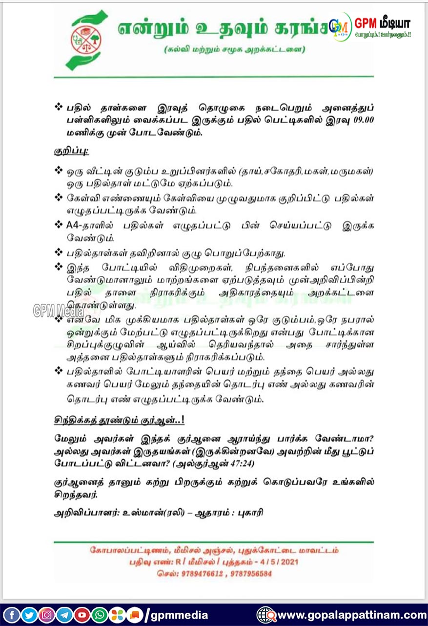 கோபாலப்பட்டிணம் என்றும் உதவும் கரங்கள் கல்வி மற்றும் சமூக அறக்கட்டளை சார்பாக பெண்களுக்கான இரண்டாம் ஆண்டு இஸ்லாமிய கேள்வி பதில் போட்டி நடைபெற உள்ளது.