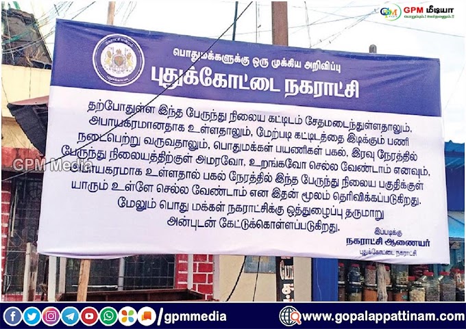புதுக்கோட்டை பேருந்து நிலையத்தில் கட்டிடங்கள் அபாயகரமான நிலையில் இருப்பதாலும், இடிக்கும் பணி நடைபெற்று வருவதாலும் பயணிகள் யாரும் உள்ளே செல்ல வேண்டாம் என நகராட்சி சார்பில் எச்சரிக்கை பேனர் வைக்கப்பட்டுள்ளது. ஆனால், அதேசமயம் பேருந்துகள் இன்னும் அங்கிருந்து இயக்கப்பட்டு வரும் நிலையில், உள்ளே செல்லாமல் பேருந்தில் ஏறி பயணம் செய்வது எப்படி என பயணிகள் கேள்வி எழுப்பியுள்ளனர்.
