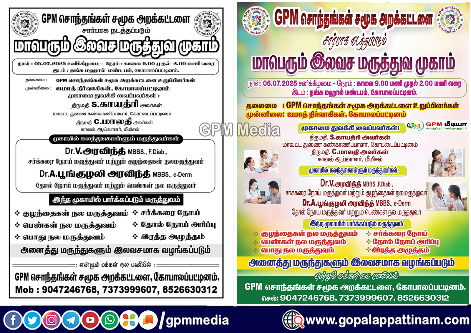 GPM சொந்தங்கள் சமூக அறக்கட்டளை சார்பாக நடத்தப்படும் மாபெரும் இலவச மருத்துவ முகாம் நாள்: 05.07.2025 சனிக்கிழமை - நேரம் : காலை 9.00 முதல் 2.00 மணி வரை இடம் : தங்க மஹால் மண்டபம், கோபாலப்பட்டினம்.